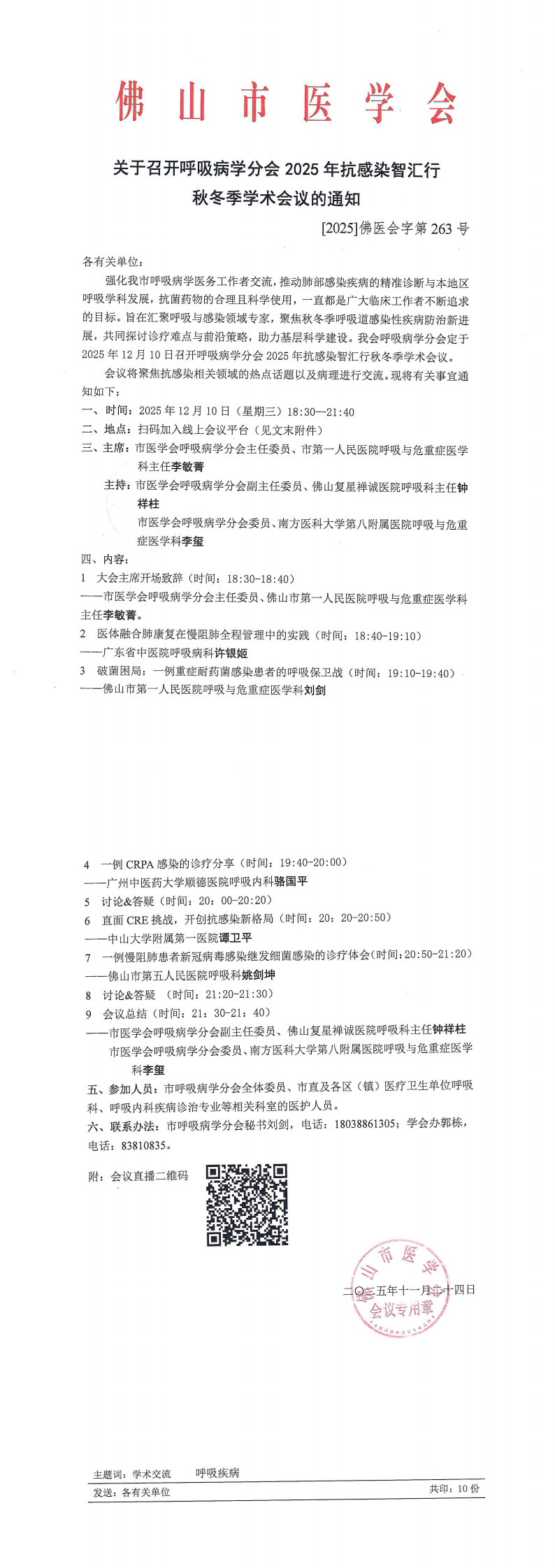 关于召开呼吸病学分会2025年抗感染智汇行秋冬季学术会议的通知