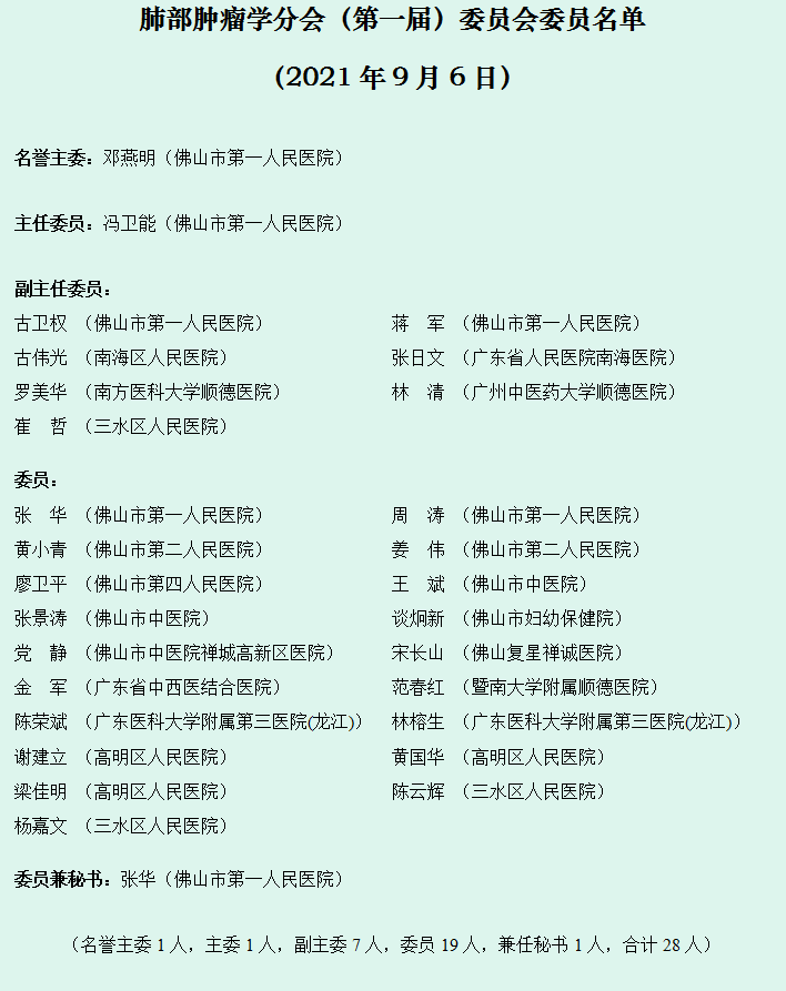 因分会工作需要,经有关单位推荐、肺部肿瘤学分会研究决定,增补陈卫军、卢奕宇、陈健智、姚维深、聂广杰、朱桥华、黄金凤、梁耀君、乔冠英、陈雁秋10人为常委,增补梁剑苗、冼海兵、王路祎、陈默、赵宁、李栋、钟光华、沈柏儒、李志华、孔之华、卫学坚、陈智贤、杨嘉麟、蔡迪14人为委员。调整后委员名单如下: