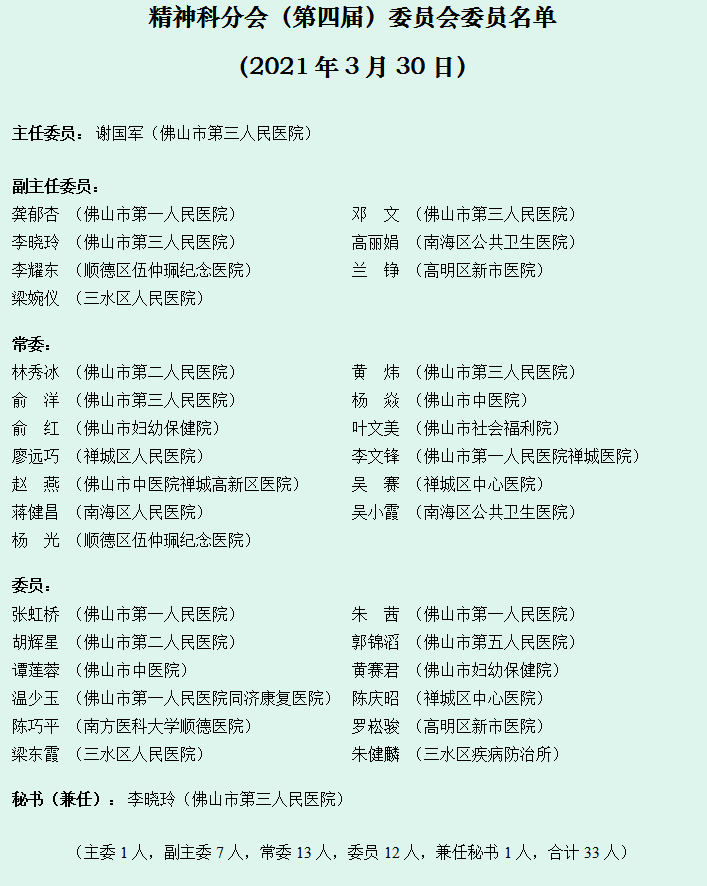 因工作原因,李耀东辞任精神科分会副主任委员。调整后委员名单如下: