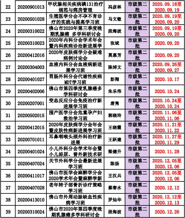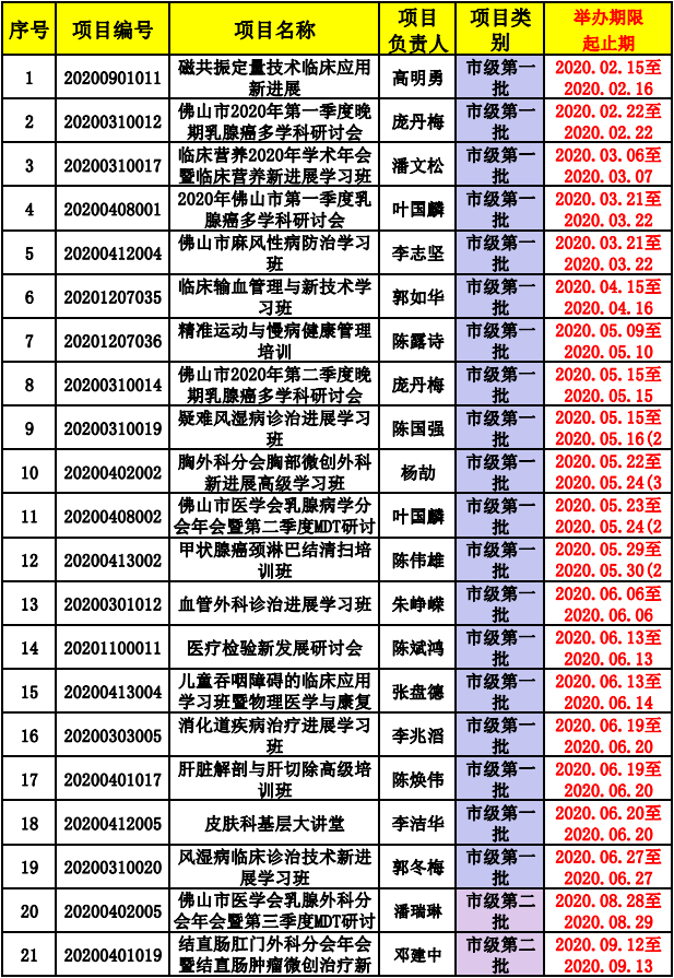 佛山市医学会2020年市级继续医学教育项目一览表